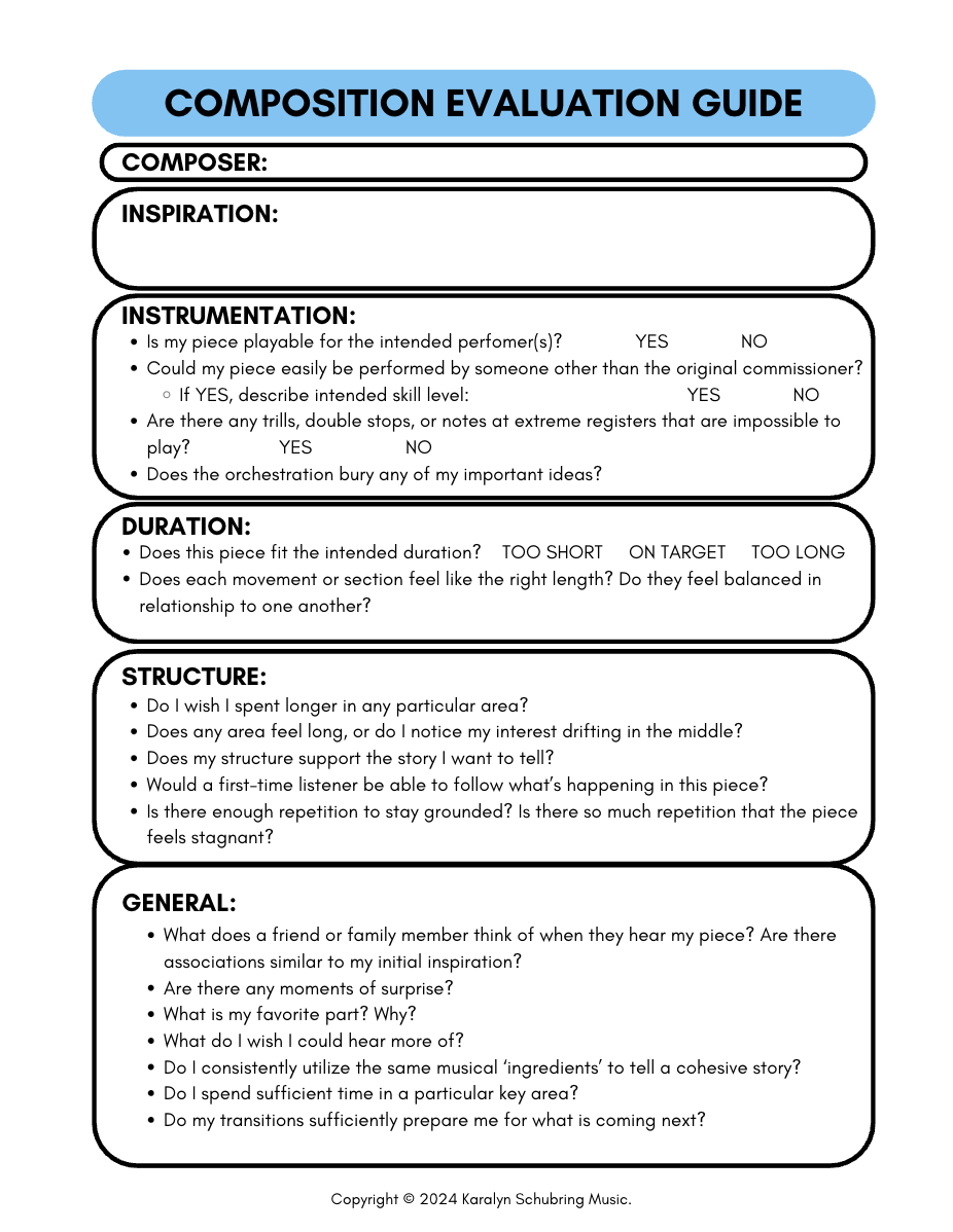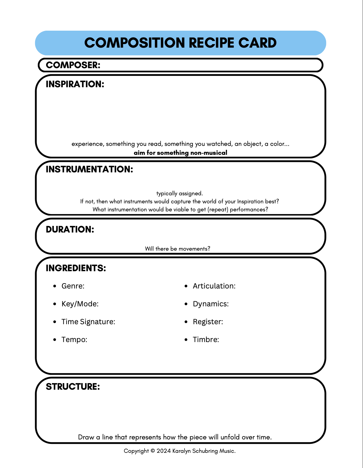 Thanks for attending Celebrating Music Creation 2026! Below are worksheets that I’ve created to help at various points in the creative process. I hope they are a helpful resource to you!