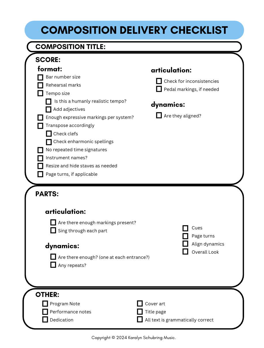 The actual checklist I use before I deliver works to professional musicians! A beautiful-looking score begets beautiful performances.