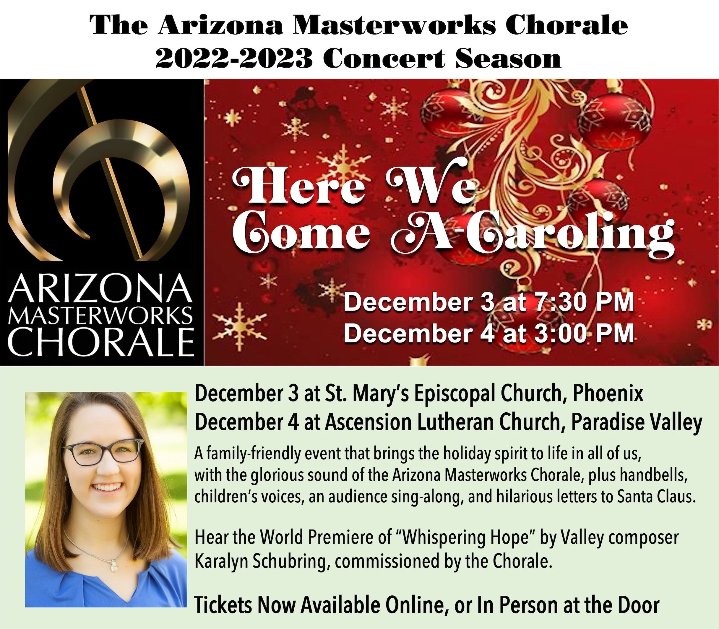 The Arizona Masterworks Chorale presents "Here We Come A-Caroling", a fun-filled, family-friendly concert of traditional Christmas songs, a world premiere, the sounds of handbells, audience carol sing-along, and letters to Santa Claus.